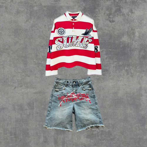2 Pcs Shirts Co-ords Sume Rugby Diamond Embroidery Stripe Polo Shirt Y2K Retro Classic Unisex Oversized Long Sleeved Shirts Sets